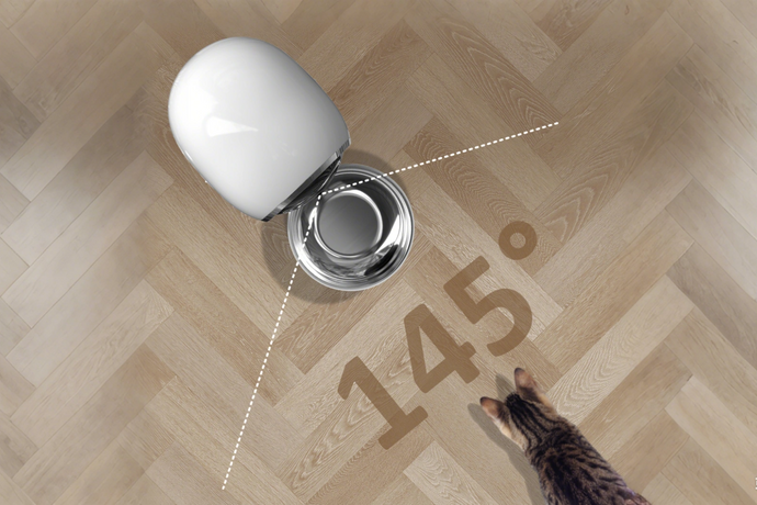 145° downward-facing cam captures your pet — not your room.